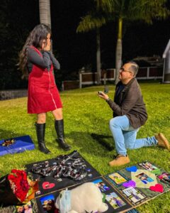 Para conmemorar un aniversario significativo, Marcos ideó una experiencia única: una cita al cine que encerraba un regalo especial. Al llegar, fue recibida por cómplices inesperados, su amigo y su esposa, quienes, con complicidad, le colocaron una venda en los ojos y la guiaron hacia el jardín, donde la aguardaban un magnífico obsequio y un exquisito ramo de flores. Al dar la vuelta, se encontró con Marcos arrodillado, listo para expresar la propuesta más conmovedora que una mujer podría desear: "¿Quieres casarte conmigo?"